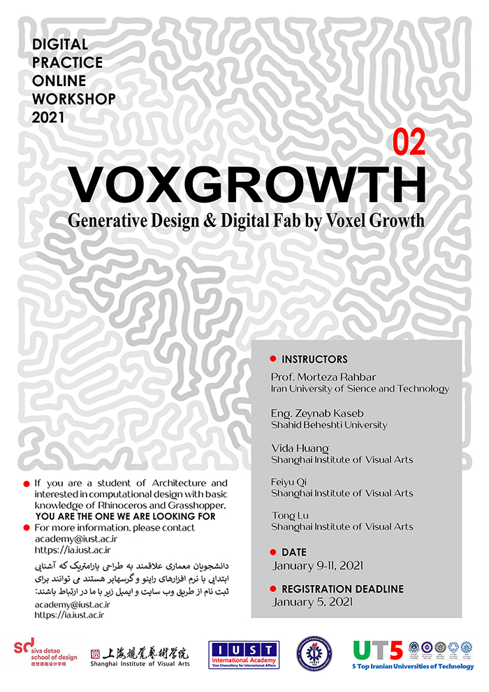 VOXGROWTH is a workshop from the series of the generative design and fabrication workshops in which Iran University of Science and Technology collaborates with Shanghai Institute of Visual Arts with an approach to teach the generative and computational design and fabrication to Architecture students. The previous workshop named VOXWARM held successfully in China. Nevertheless, due to the pandemic period, this workshop will be online and students from both sides can participate. VOXGROWTH is a three-day workshop in which five instructors from both sides will contribute to prepare students to employ Grasshopper environment to use differential growth to be able to design generatively. The output of the workshop will be the students’ digital files and posters. At the end, the students will be provided with their certification sealed by both sides.